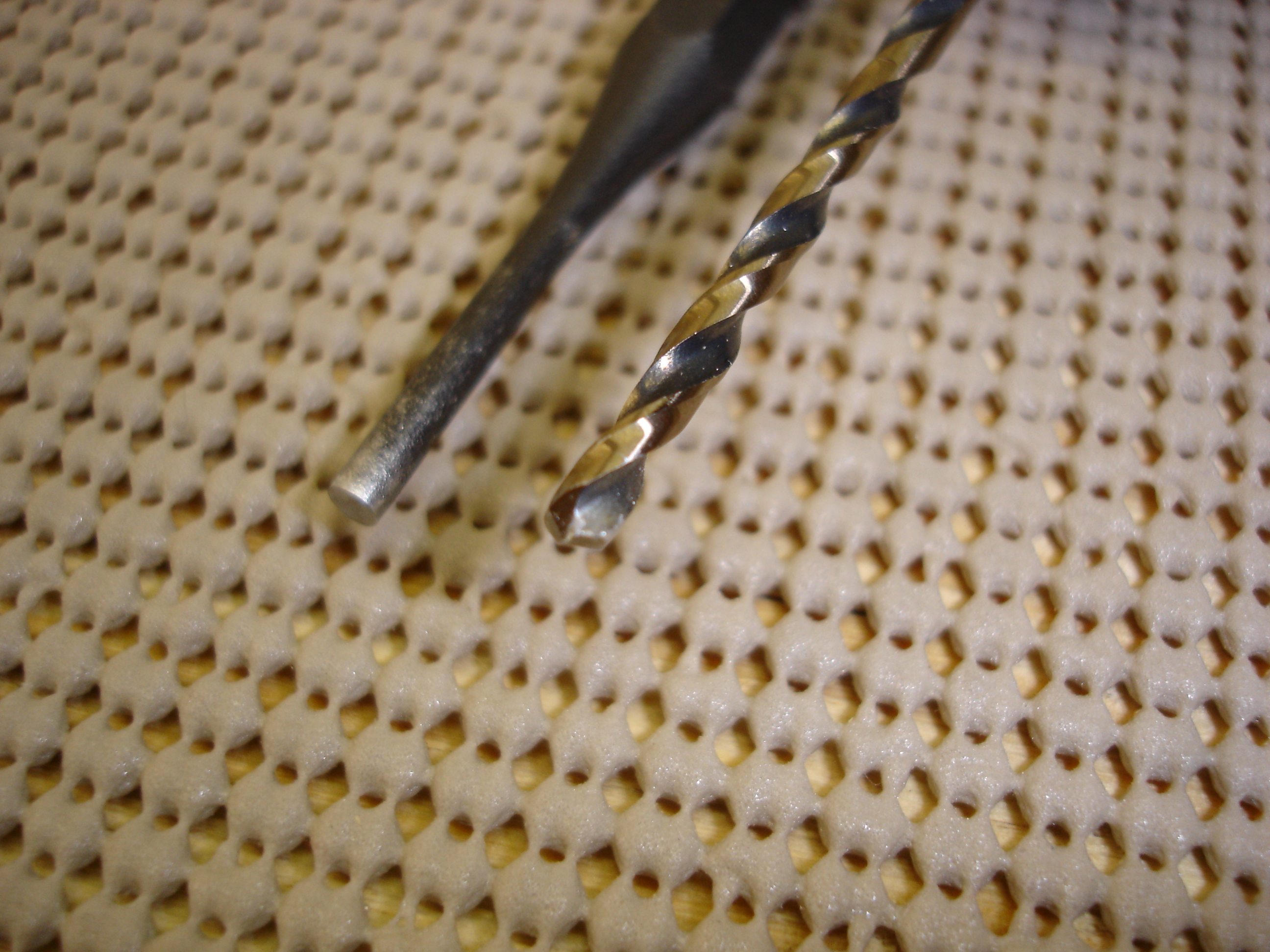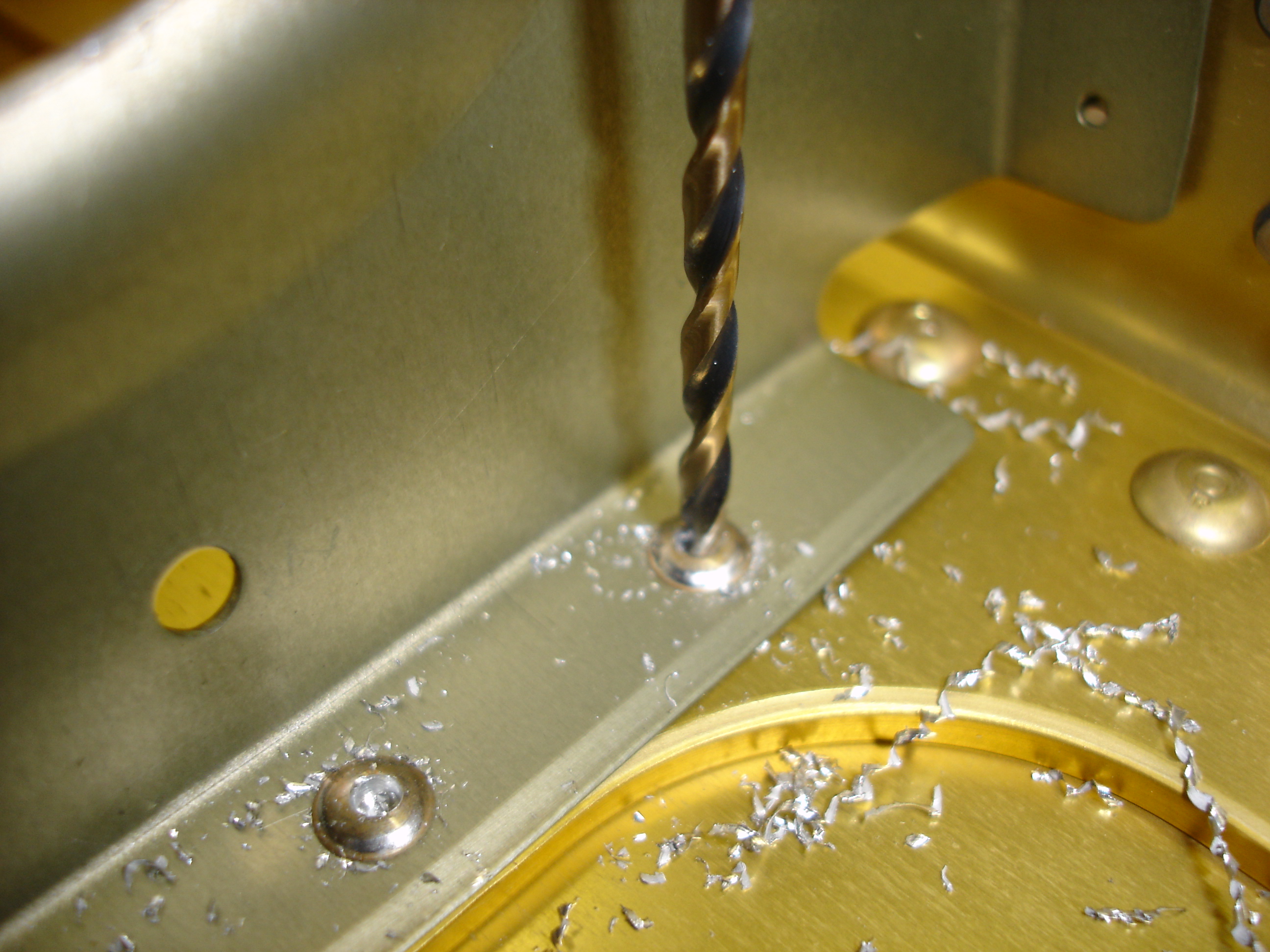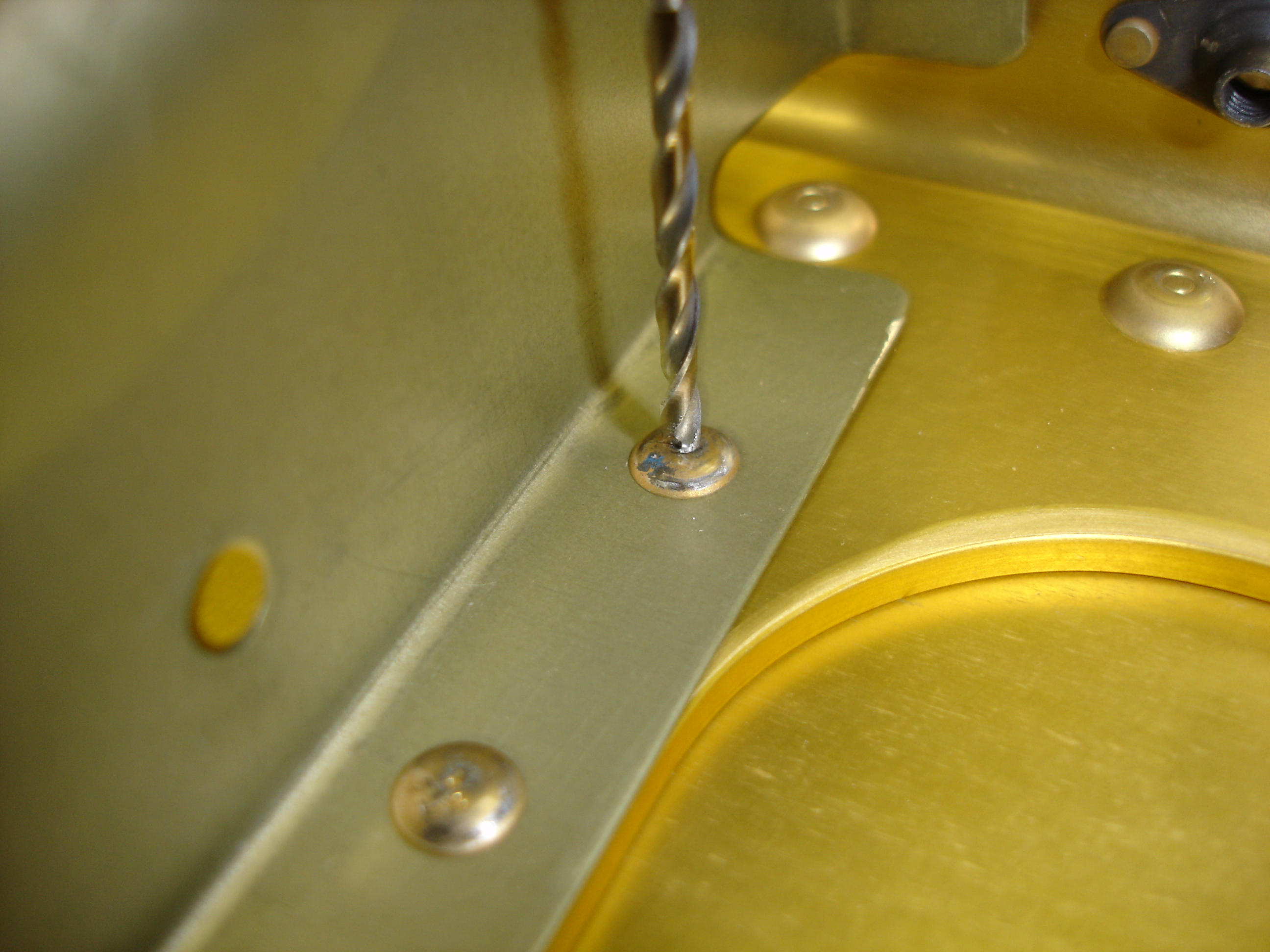 Note that it's very important to drill in the center of the rivet and drill it straight.