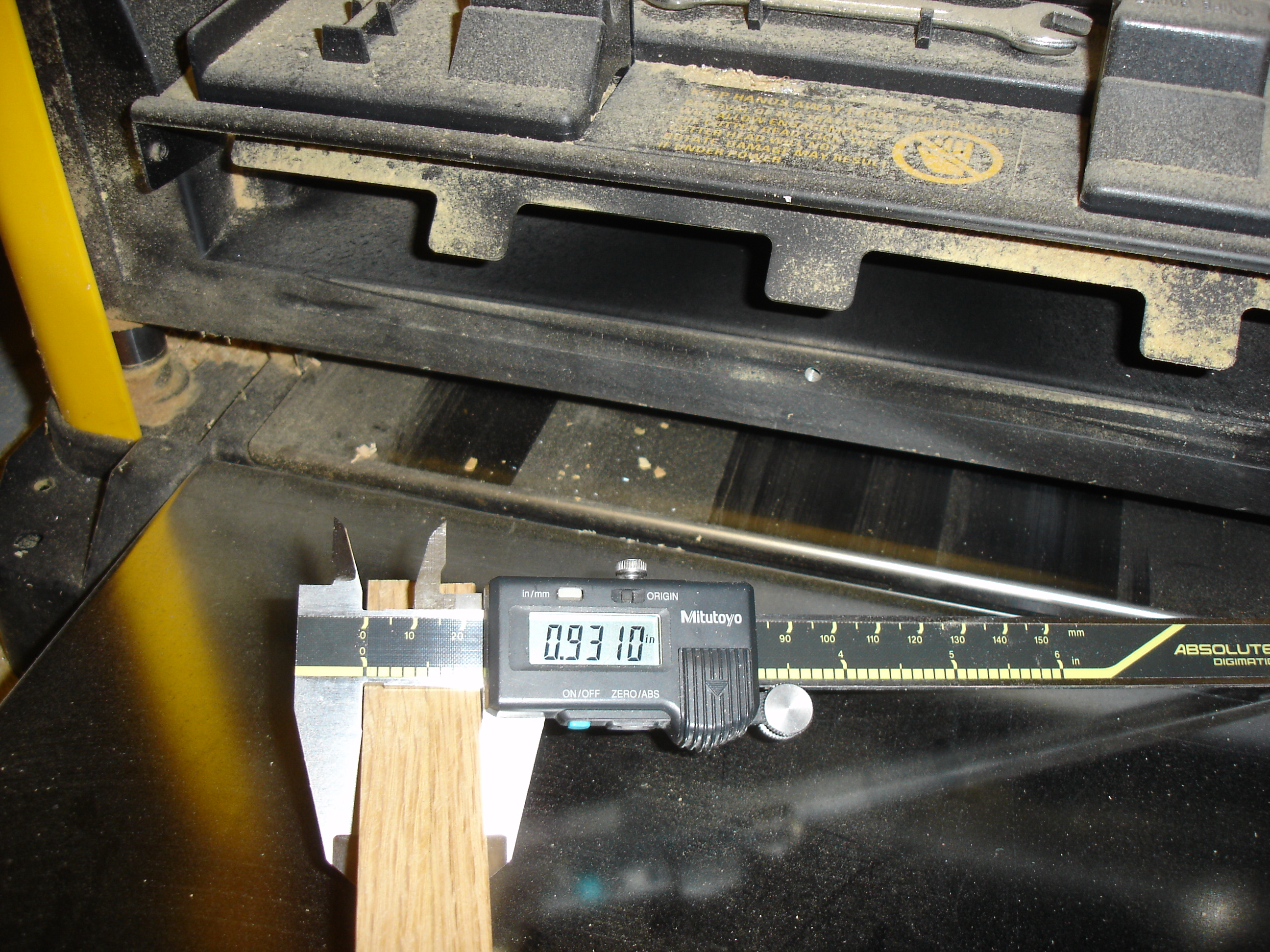 It was 0.930 inches. I didn't have any oak that thick, so I found a piece of 5/8 thick oak flooring,