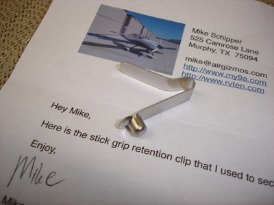 Today, I got two items in the mail for the airplane. The first is this nifty clip which I will be using to hold the passenger stick in place. Mike Schipper was nice enough to mail me one of the leftover clips which he had ordered from McMaster-Carr. Thanks, Mike! |