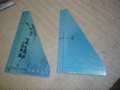Here I've laid out and drilled the rivet hole patterns. Notice that the hole pattern which is on the edge that will attach to the longeron uses 15/32 edge spacing rather than 7/16 as the plans showed. Also note (and you may need to click the full sized image to see this) that I've intentionally refrained from drilling a hole in the location of the one I had previously drilled through the longeron and the weldment. I'll transfer drill that one hole into this bracket after drilling the rest. |