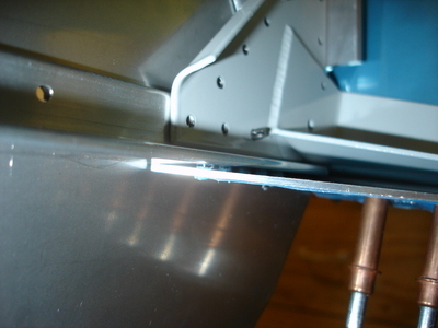 After all the longeron holes were drilled, I found that the gap between the gusset and the firewall stiffener is much tighter than with the previous gusset. As with the right side, the shim needs to be roughly .063 thick at the aft edge and taper down to nothing at the forward edge. |