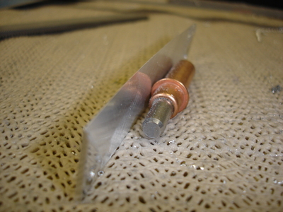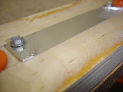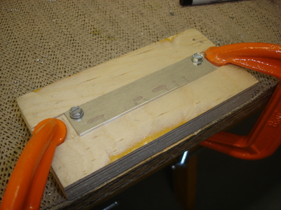 Here's the same wood block which was used for filing the other shim. This shim is screwed in position and ready for thinning. |